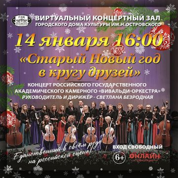 14 января в 16:00 в Виртуальном концертном зале Городского дома культуры им.Н.Островского состоится трансляция концерта «Старый Новый год в кругу друзей» из Концертного зала имени П.И. Чайковского Московской государственной академической филармонии.