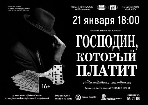 21 января в 18:00 в Городском доме культуры им.Н.Островского состоится спектакль «Господин, который платит» Молодежного театра «Наш мир».
