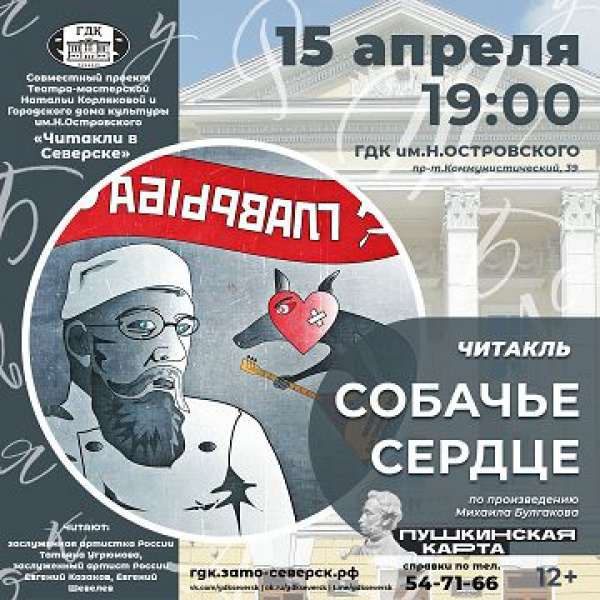 15 апреля в 19:00 в нашем Доме культуры состоится ещё одно мероприятие в рамках совместного проекта Театра-мастерской заслуженного деятеля искусств России Натальи Корляковой и Городского дома культуры - «Читакли в Северске». В этот вечер зрителей ждёт читакль «Собачье сердце» (12+) по произведению талантливого отечественного писателя начала 20 века Михаила Булгакова.