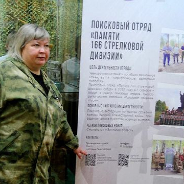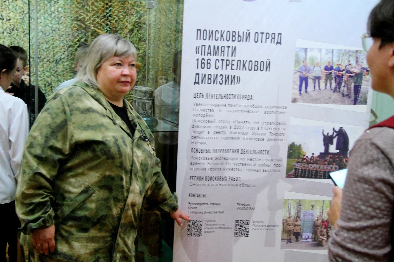 Открыла выставку и рассказала о прославленной дивизии и работе поискового отряда «Памяти 166 стрелковой дивизии» его руководитель, педагог дополнительного образования Северского кадетского корпуса, Екатерина Вячеславовна Крапп.