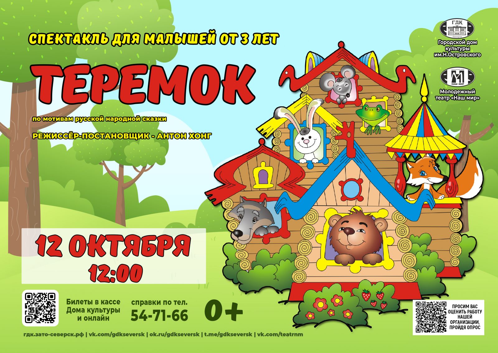 В воскресенье, 12 октября, в 12:00 в Городском доме культуры им.Н.Островского состоится спектакль для малышей «Теремок» (0+) Молодежного театра «Наш мир». Это будет не просто спектакль, это волшебное погружение в мир русской сказки, которое подарит радость и улыбки малышам.