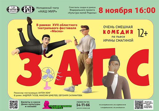 8 ноября в 16:00 в Городском доме культуры им.Н.Островского в рамках XVII областного театрального фестиваля «Маска» состоится спектакль «ЗАГС» (12+) Молодежного театра «Наш мир». Эксцентричная комедия, полная забавных ситуаций и недоразумений, которая происходит в самом сердце ЗАГСа, вошла в программу фестиваля наряду с постановками ещё пяти театров региона.