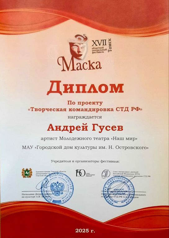 Артист Молодежного театра «Наш мир», ведущий мастер сцены Андрей Гусев удостоен Специального приза в рамках проекта «Творческая командировка СТД РФ» на XVII областном театральном фестивале «Маска». Награду Андрей получил на торжественной церемонии закрытия фестиваля «Маска», которая состоялась 10 ноября в томском ТЮЗе. Это достойное признание его труда и мастерства! Мы гордимся Андреем и желаем ему дальнейших творческих успехов!